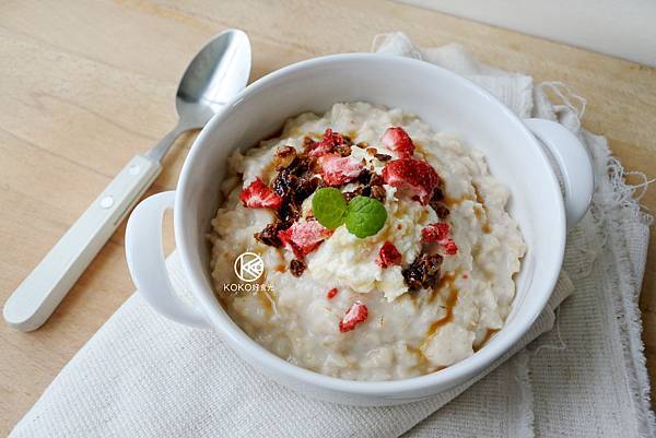 先將大燕麥片(你看還是很健康對吧)用牛奶熬得軟糯,起鍋前再加點蜂蜜和威士忌調出令人愉悅的香甜與醇厚,最後撒上焦糖脆片與草莓乾豐富口感~最適合假日早上吃,整個暖暖的、甜甜的、還有點茫茫的,吃飽飽倒回去繼續睡。嘛,人生很難,但幸福可以很簡單😌